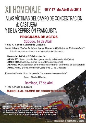 Está aquí: InicioNoticiasXII Homenaje a las Víctimas de Campo de concentración de Castuera y de la represión franquista que se celebrará el próximo 16 y 17 de abril de 2016 en Castuera (Badajoz) . AMECECA participa en el acto.