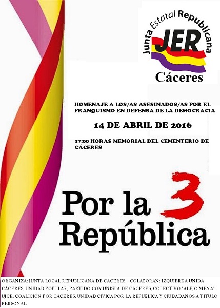 Este jueves 14 de abril se celebrará el HOMENAJE A LOS/AS ASESINADOS/AS POR EL FRANQUISMO que todos los años organiza la Junta Local Republicana de Cáceres.