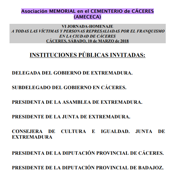 INSTITUCIONES PÚBLICAS INVITADAS A LA VI JORNADA-HOMENAJE A TODAS LAS VÍCTIMAS Y PERSONAS REPRESALIADAS POR EL FRANQUISMO EN LA CIUDAD DE CÁCERES (10-III-2018)