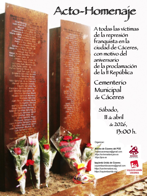 ACTO-HOMENAJE A TODAS LAS VÍCTIMAS DE LA REPRESIÓN FRANQUISTA EN LA CIUDAD DE CÁCERES con motivo del aniversario de la proclamación de la II República (11 abril 2026)